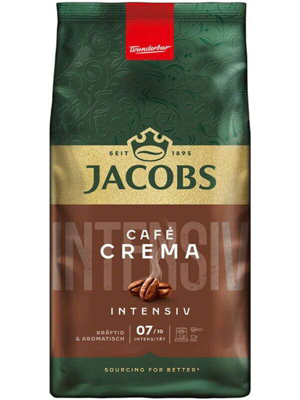 Jacobs Crema INTENSIV - this blend offers a balanced flavor profile with a distinct and strong aroma, which is ideal for lovers of intense coffee. It is the perfect choice for fully automatic coffee machines, where its properties can be fully expressed. It is suitable for preparing strong crema coffee, but also for milk specialties such as latte macchiato or cappuccino.